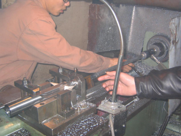 2、根據(jù)實際情況設(shè)計工裝,將工件固定在機床中托板上。并可以設(shè)計導向套安裝在工件前端面,引導深孔鉆進入。此種方法不需在深孔加工前加工引導孔。大大提高了加工效率。改造深孔鉆鏜床刀具的安裝可根據(jù)工件的實際情況選擇方式:機床轉(zhuǎn)速和最小進給量都能滿足加工要求時,旋轉(zhuǎn)夾具錐柄直接安裝在機床主軸錐孔內(nèi),刀具安裝在旋轉(zhuǎn)夾具,機床主軸通過旋轉(zhuǎn)夾具帶動刀具作旋轉(zhuǎn)運動,進給運動由大托板提供。