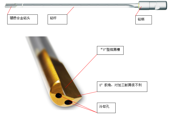 通常槍鉆都是采用釬焊式的制造工藝,一般由鉆柄、鉆桿、鉆頭三部分焊接在一起。槍鉆中間有一通孔,是切削液進(jìn)入切削區(qū)的通道。