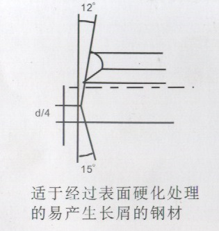 減小槍鉆內(nèi)、外刃角度,即槍鉆內(nèi)外刃磨的更平一些,對加工斷屑有很大的幫助。另外,切削線速度的提高,對斷屑效果也很明顯。加工不易斷屑材料時(shí),槍鉆端刃可以參考如下角度: