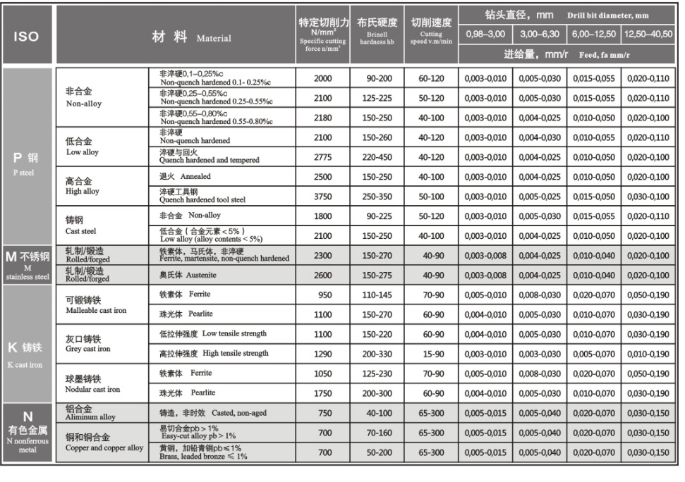 切削用量的選擇與切削過程以及切屑的行程有關(guān),同時也與被加工零件材料、精度要求和機床特性有關(guān)。 1切削速度 切削速度主要取決于刀具材料,受到鉆頭耐用度和機床轉(zhuǎn)速的限制。目前,高速鋼槍鉆一般取切削速度V為35-70m/min; 2進給量 進給量主要受工藝系統(tǒng)(刀具、工件和機床等)剛度和強度的限制。此外,還受到加工表面質(zhì)量、排屑效果和切削液的性質(zhì)等因素的影響。目前,高速鋼槍鉆常取f為0.01-0.032mm/r,直徑大者取上限。 槍鉆切削參數(shù)參考下表: