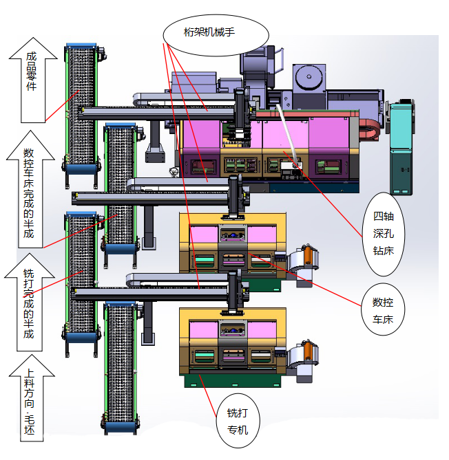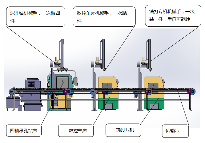 該生產(chǎn)線,將凸輪軸銑打兩端頭專機(jī)、數(shù)控車床專機(jī)和深孔鉆機(jī)床有機(jī)結(jié)合,共用一條桁架機(jī)械手裝卸工件。成流水線式排列。三道工序組成一個加工模塊,工序間的物流轉(zhuǎn)移都由桁架機(jī)械手完成。使凸輪軸粗加工效率發(fā)揮至最大,人工降至最少。提高了加工效率,降低了生產(chǎn)成本。